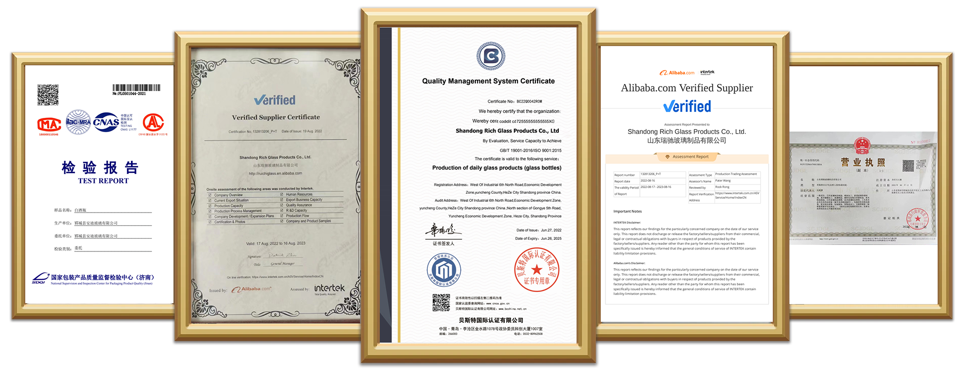 We company has 15 years of production experience in the glass packaging industry. All products have passed ISO9001 quality management system certification and SGS and other food safety certification.